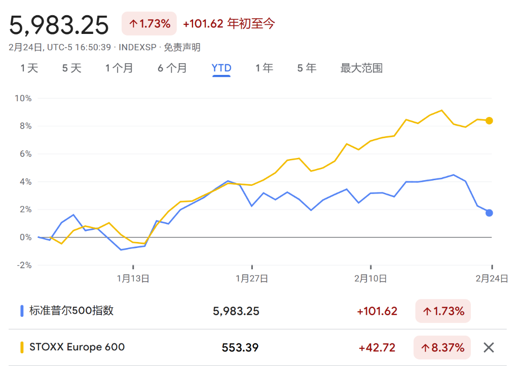 本年以来,欧洲斯托克600指数也曾涨超了8%,而好意思国标普500指数则上升近2%。