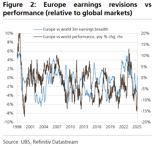 瑞银暗示,与众人市集比较,欧洲的相对盈利修正(relative earnings revisions)大幅改善,且这一改善尚未都备体目下市集施展上。